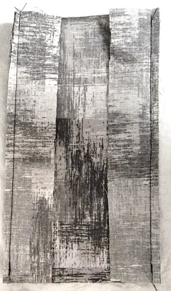 Step 13: Pin the felt pieces to the wrong side of your liner, as shown. The 3 felt pieces will overlap in such a way that each felt’s side edges will align with the brim’s pressed-open seams (see upper photo).