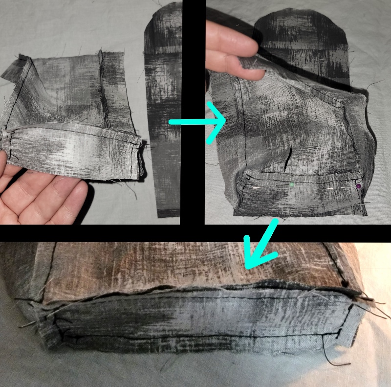 Notice in the bottom picture that I place perpendicular pins for step 16b, and then I use parallel pins for step 16c. I leave all these pin in, removing them only as the sewing needle approaches them in step 17. This helps me to keep a nice, gradual curve.